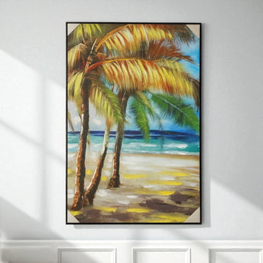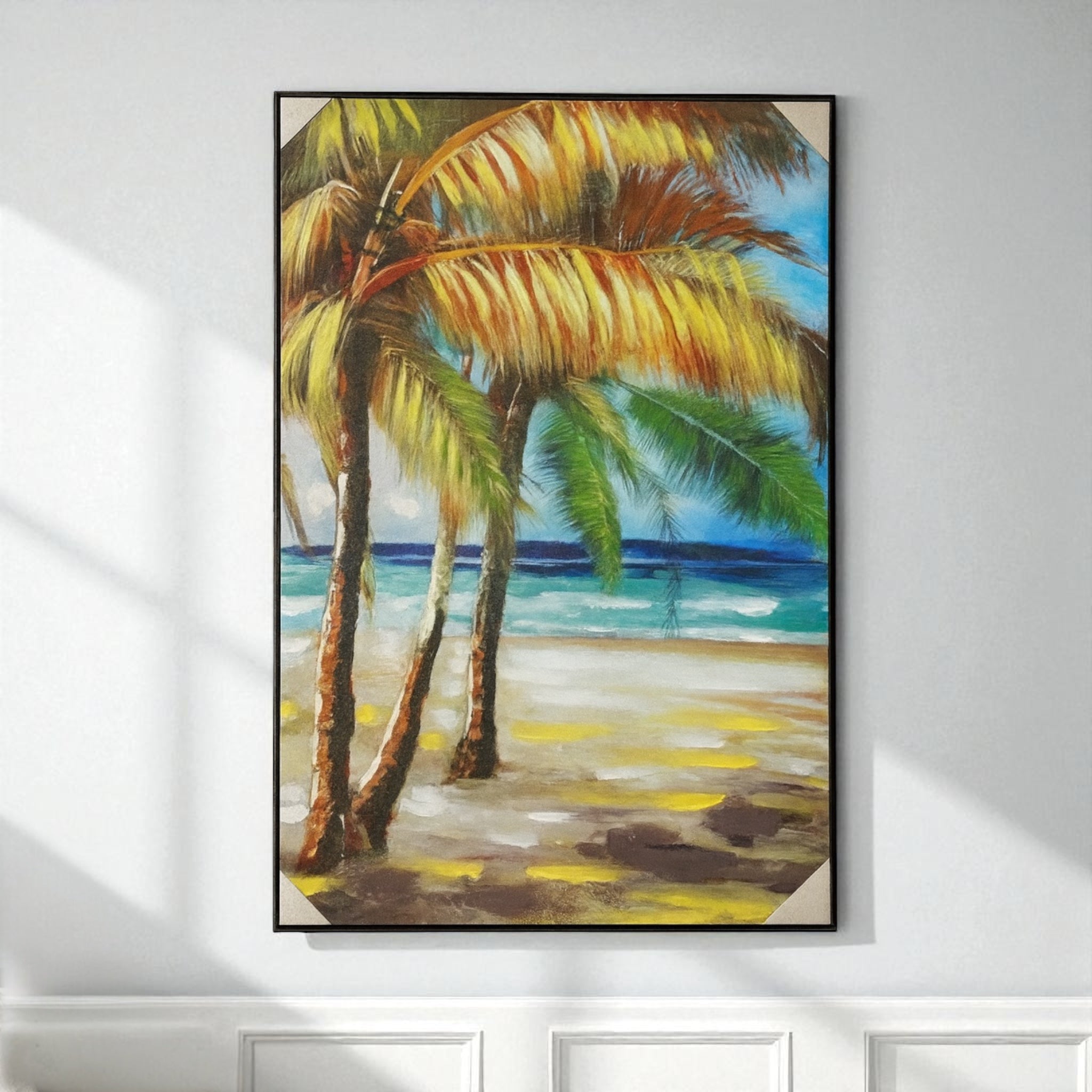 ტილოზე გამოსახული პალმები და ზღვის ხედი მყუდრო და ენერგიული ატმოსფეროს ქმნის, თითქოს სანაპიროს სიმშვიდესა და თავისუფლებას გადმოსცემდეს.