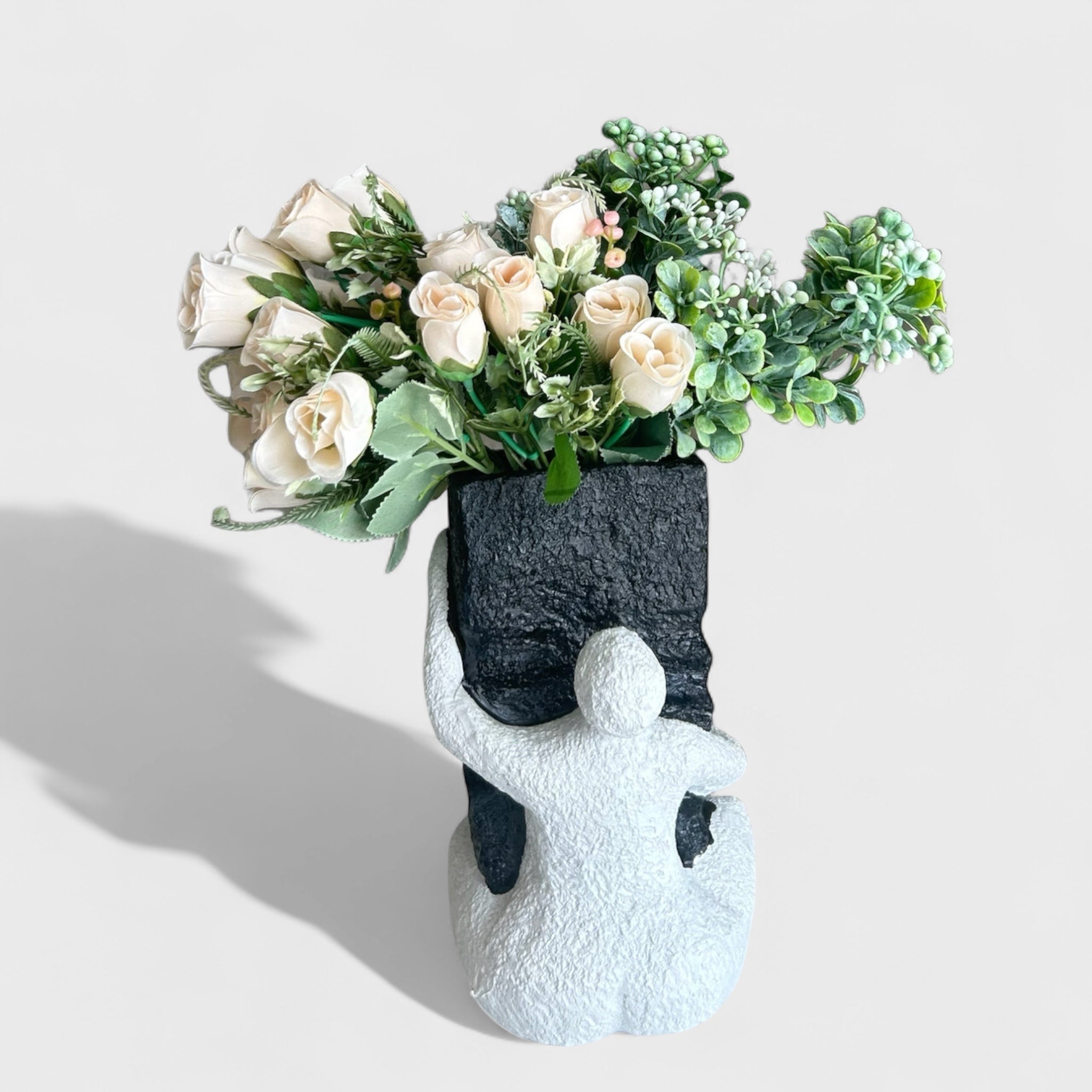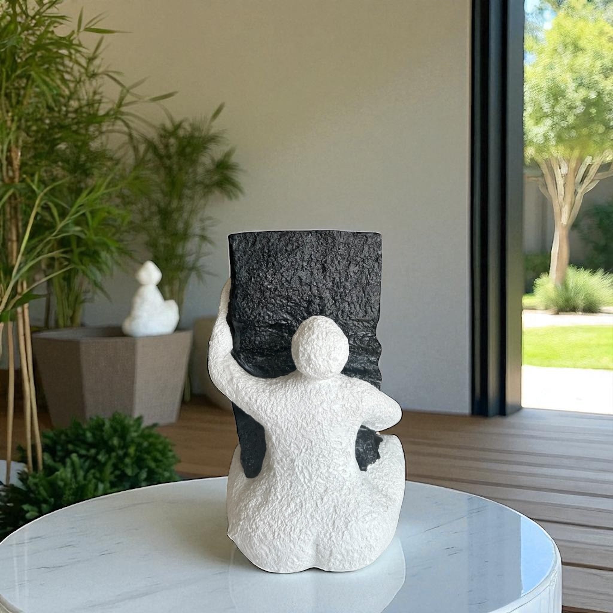 ქოთნის უნიკალური ფორმა, სადაც თეთრი ფიგურა „ეხუტება“ შავ ტექსტურიან ზედაპირს, სივრცეს მატებს არტისტულ და ემოციურ ხასიათს.