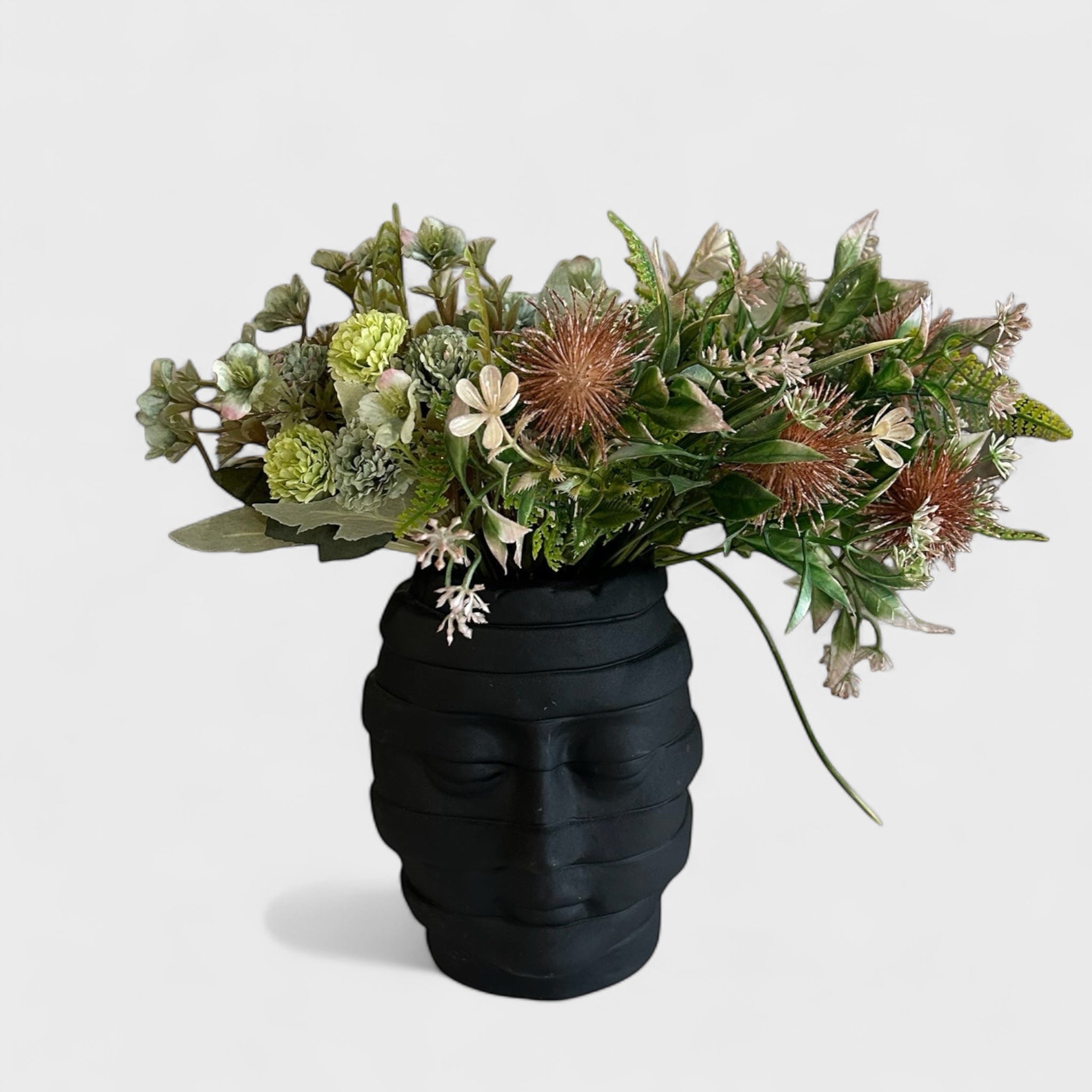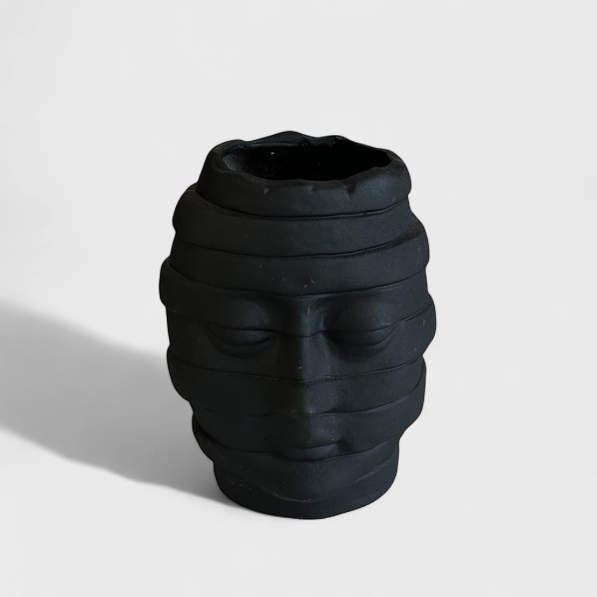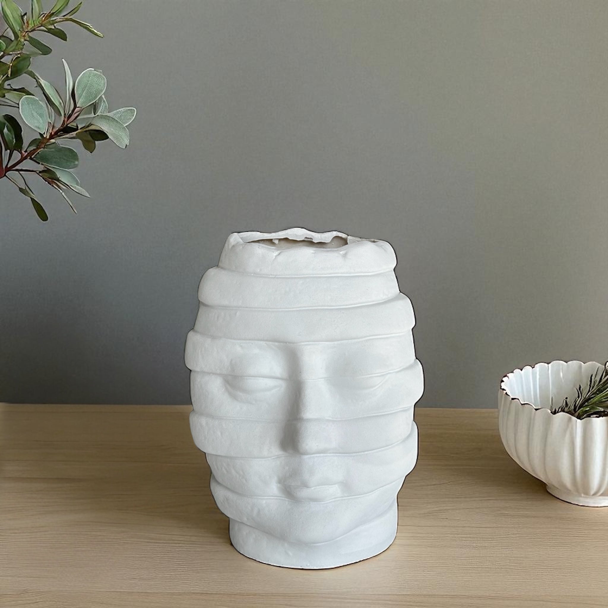 თავის ფორმის ვაზა ქმნის ძლიერ ვიზუალურ ეფექტს და ინტერიერს სძენს გამორჩეულ ხასიათს.