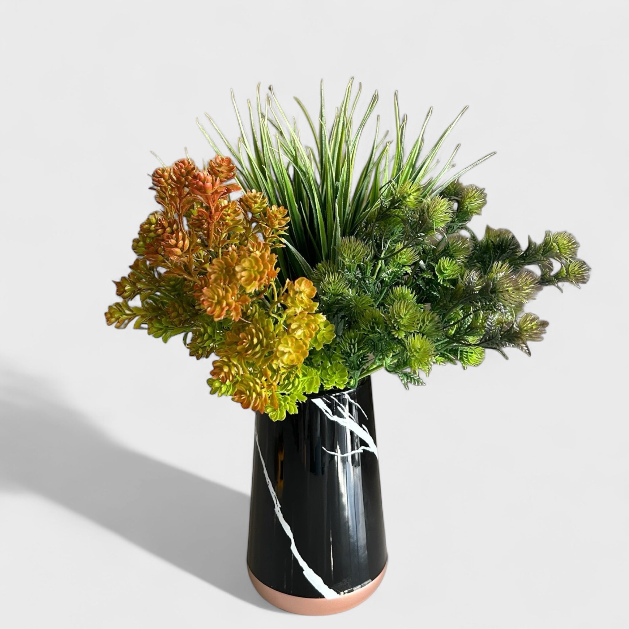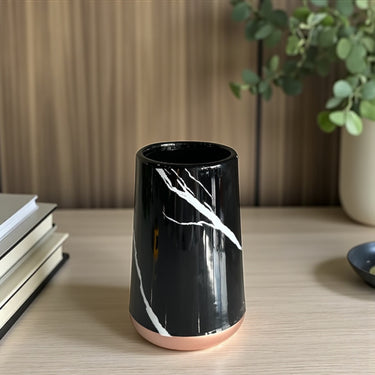 შავი, მარმარილოს ეფექტის ვაზა თავისი ელეგანტური ხაზებით და ოქროსფერი საფუძვლით ქმნის თანამედროვე და დახვეწილ ატმოსფეროს.