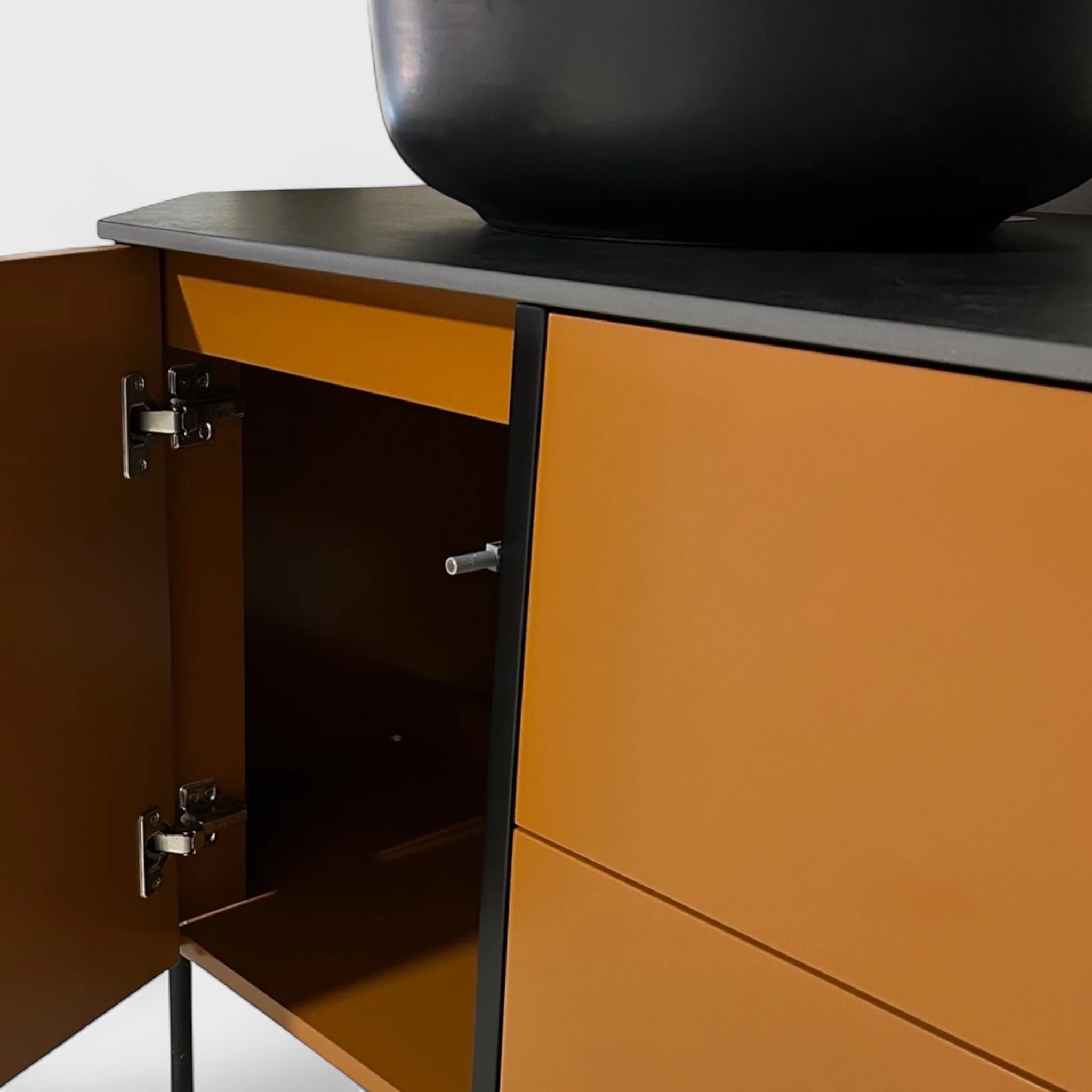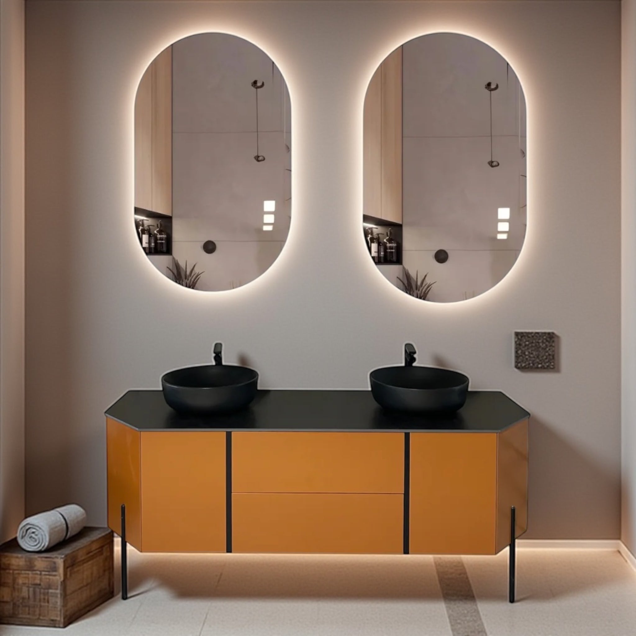 გეომეტრიული ხაზებით და ორიანი სარკით გაფორმებული დიზაინი აბაზანას ანიჭებს გამორჩეულ და თანამედროვედ დახვეწილ იერს.