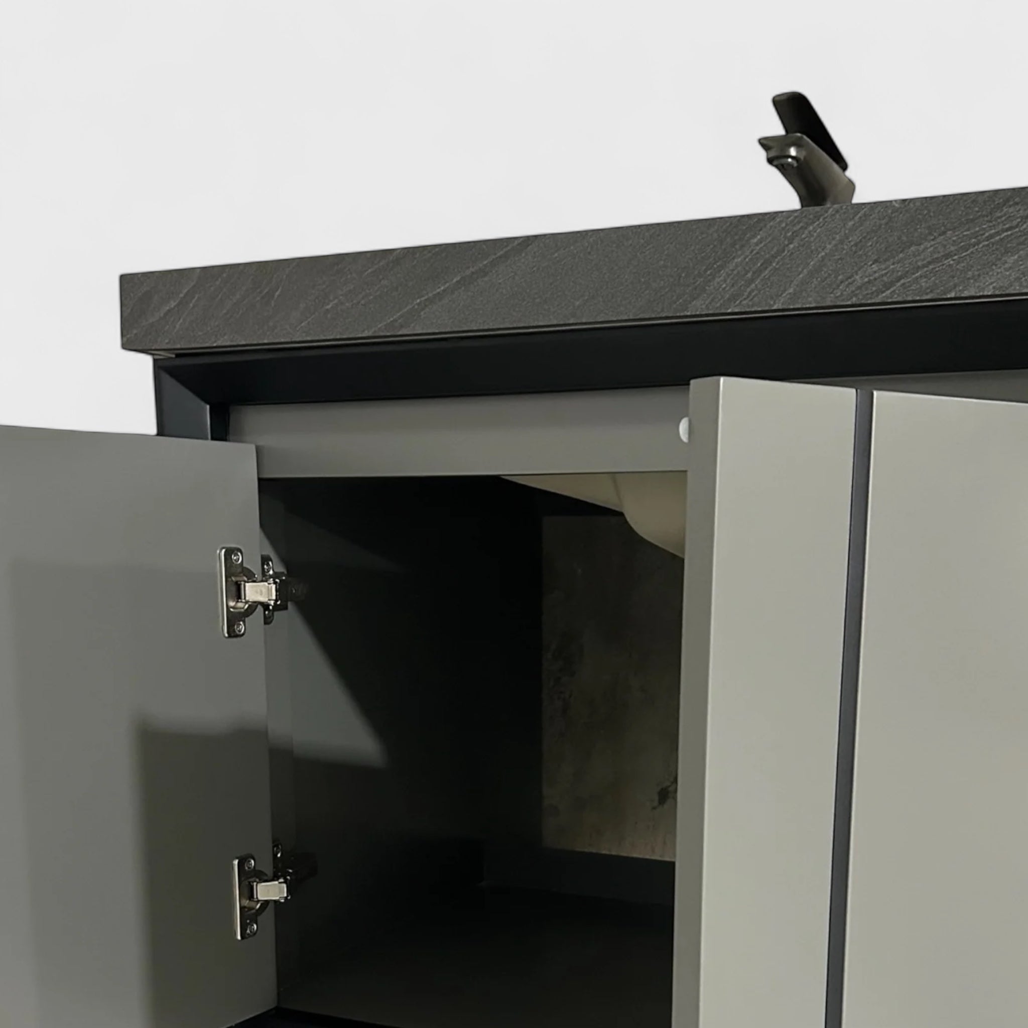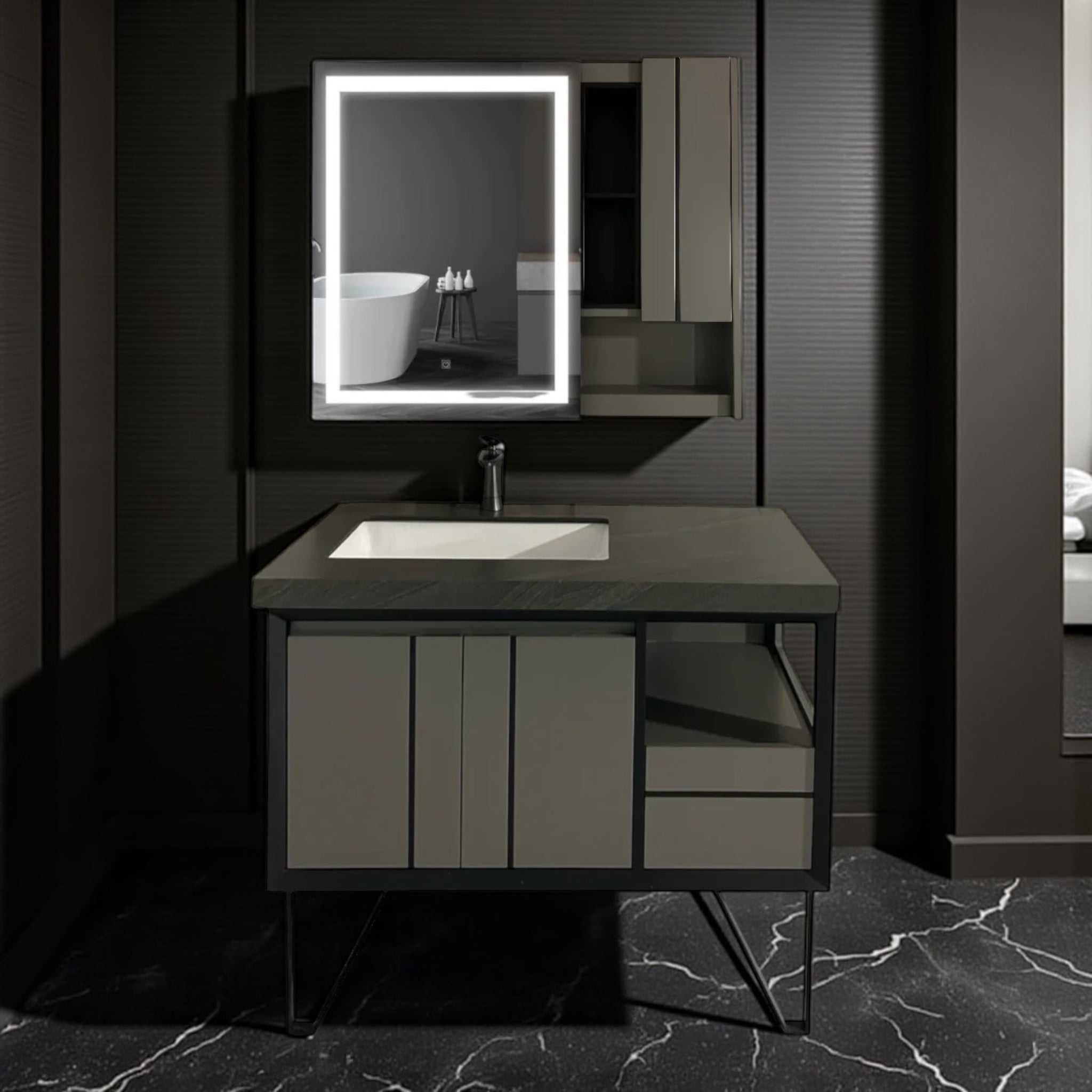 Type სარკე ლედ განთებით, პანელის ტექნოლოგიით დამუშავებული ხე (ნესტგამძლე),უჟანგავი რკინის დეტალებით, კერამოგრანიტის ზედაპირი, უჟანგავი ონკანი კერამიკის ნიჟარა.
