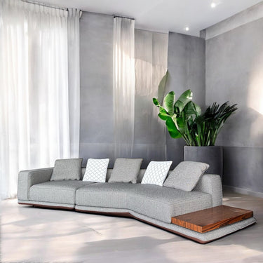 მონოლითური ფორმა და გვერდით ინტეგრირებული მაგიდა ფუნქციურობას აერთიანებს სტილთან, რაც დივანს ინტერიერის მთავარ ელემენტად აქცევს.