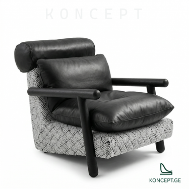 მასიური ფორმა და გამოკვეთილი კონსტრუქცია ქმნის ძლიერი ხასიათის მქონე სავარძელს. ხის მუქი ჩარჩო და რბილი ბალიშების კომბინაცია ინტერიერში თანამედროვე და გამორჩეულ იერს აყალიბებს.