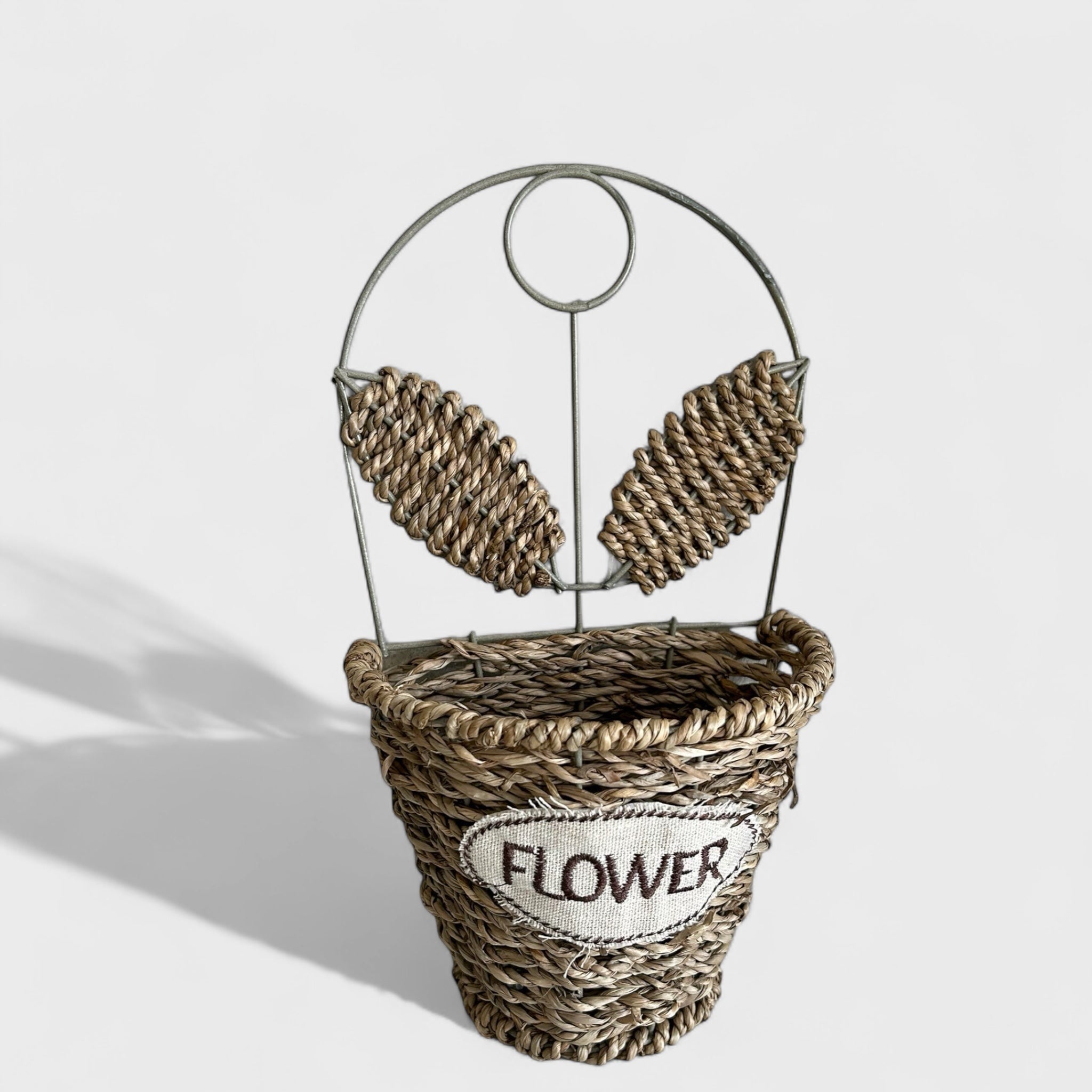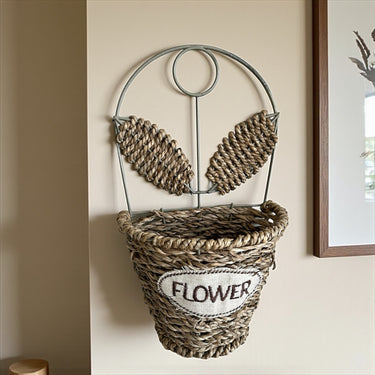 კედელზე სათავსო კალათა ბუნებრივი ტონალობით, რომელიც სივრცეს ბუნებრივ და თბილ შტრიხს სძენს.