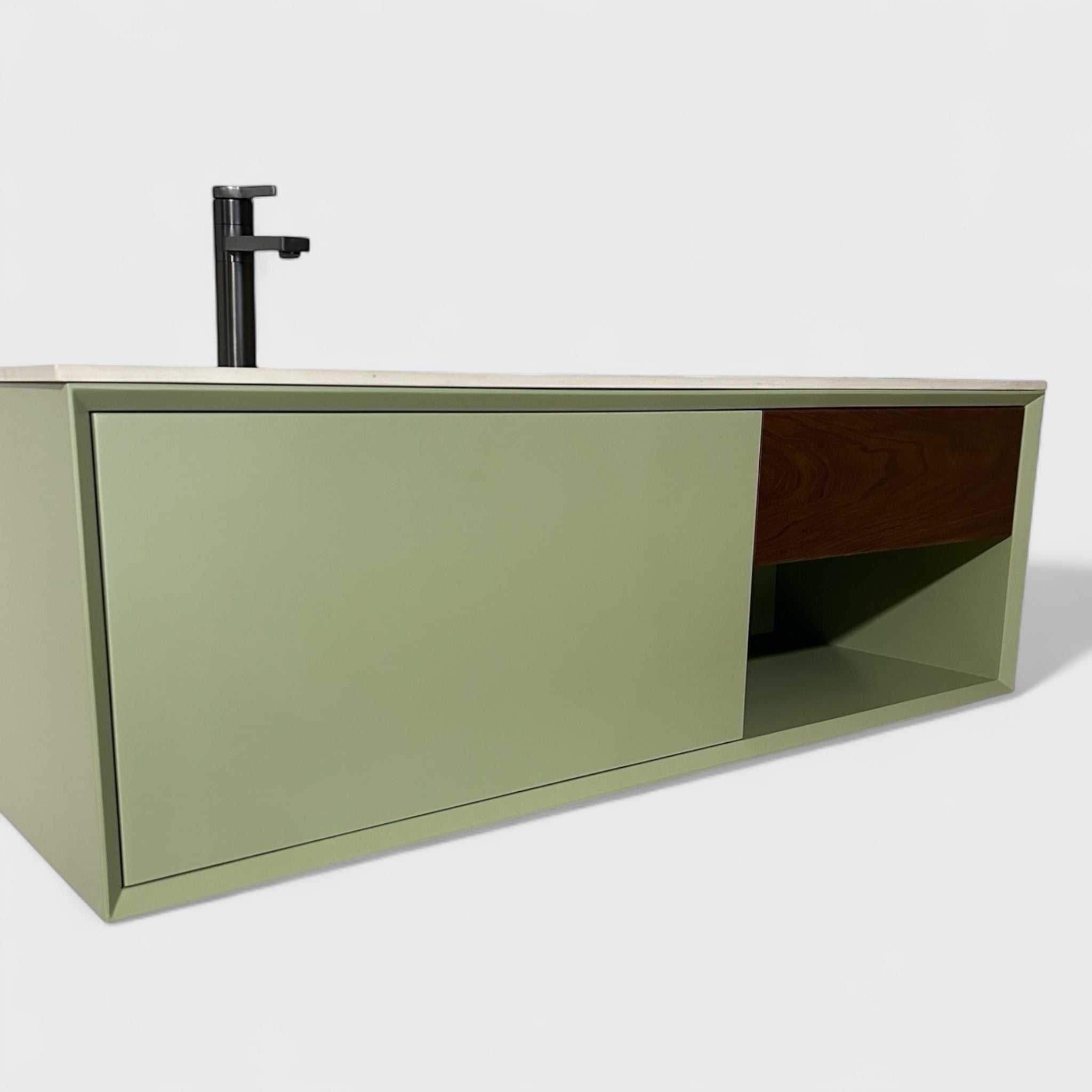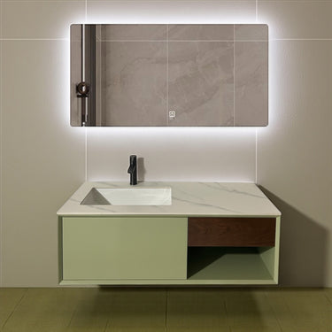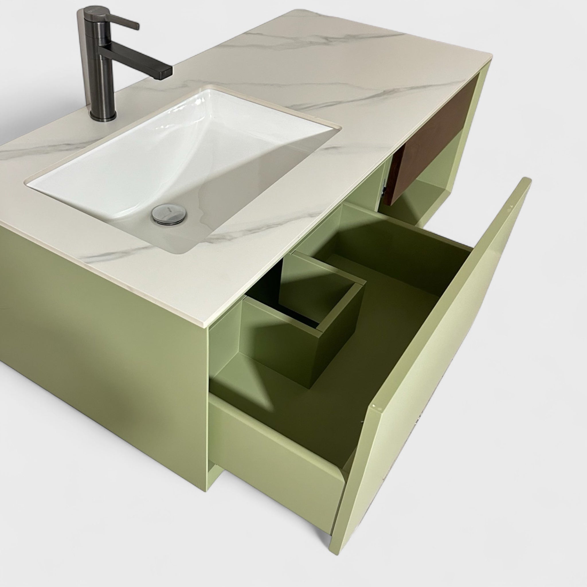გათლილი ფორმები და დახვეწილი ფერების კომბინაცია ავეჯს აძლევს თანამედროვე და სუფთა ვიზუალს, რომელიც ჰარმონიულად ერწყმის აბაზანის ინტერიერს.