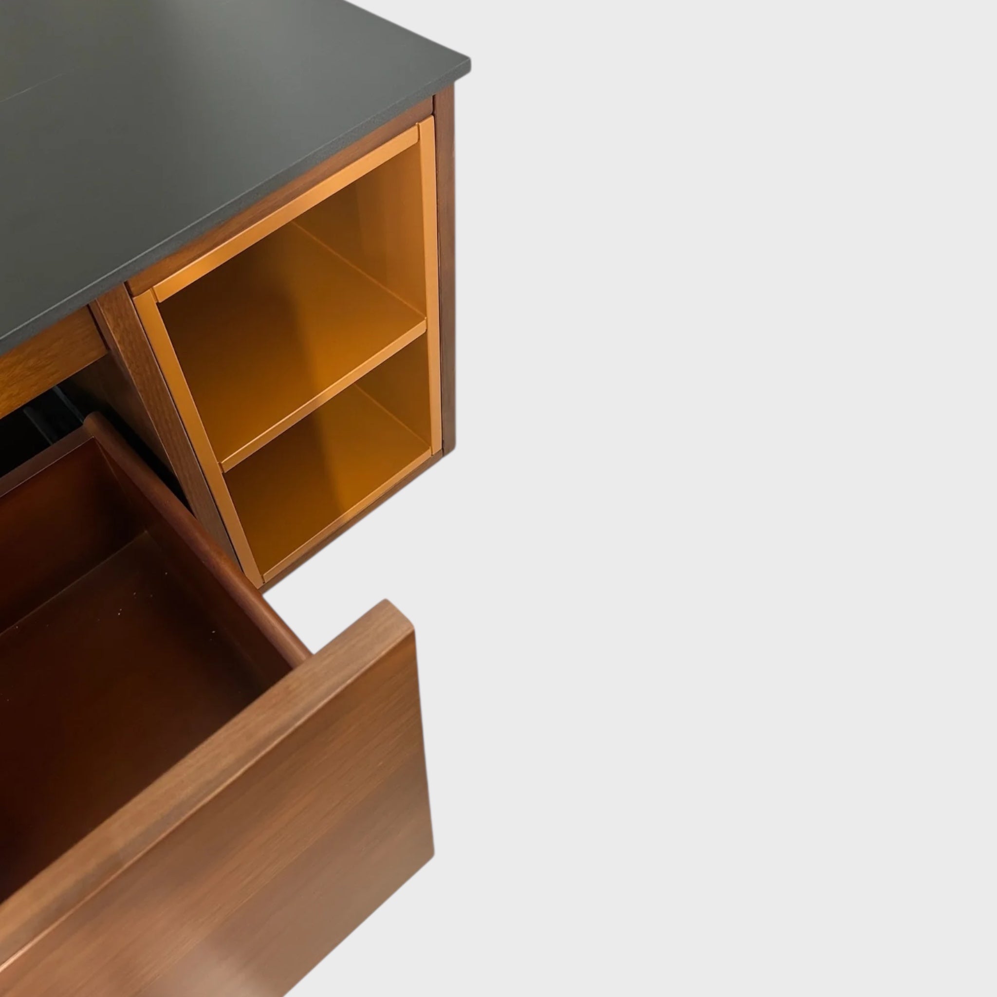 ზედა ფართო კონსტრუქცია მუშაობს როგორც ფუნქციური სამუშაო სივრცე, ხოლო დიდი უჯრა და ღია თაროები უზრუნველყოფს ნივთების ორგანიზებულ და ხელმისაწვდომ შენახვას. რბილი გახსნა–დახურვის სისტემა ყოველდღიურ გამოყენებას კომფორტულსა და გამართულს ხდის.