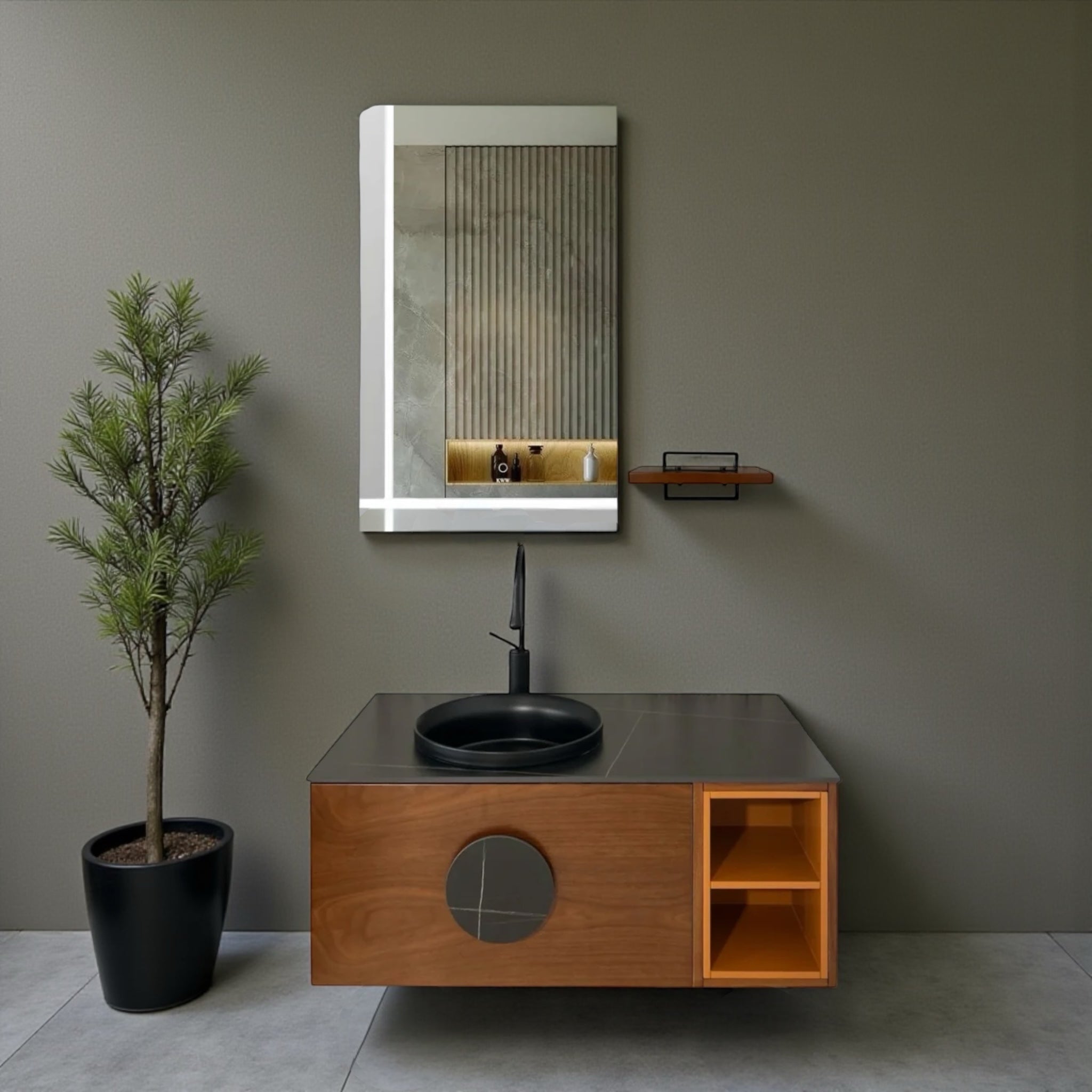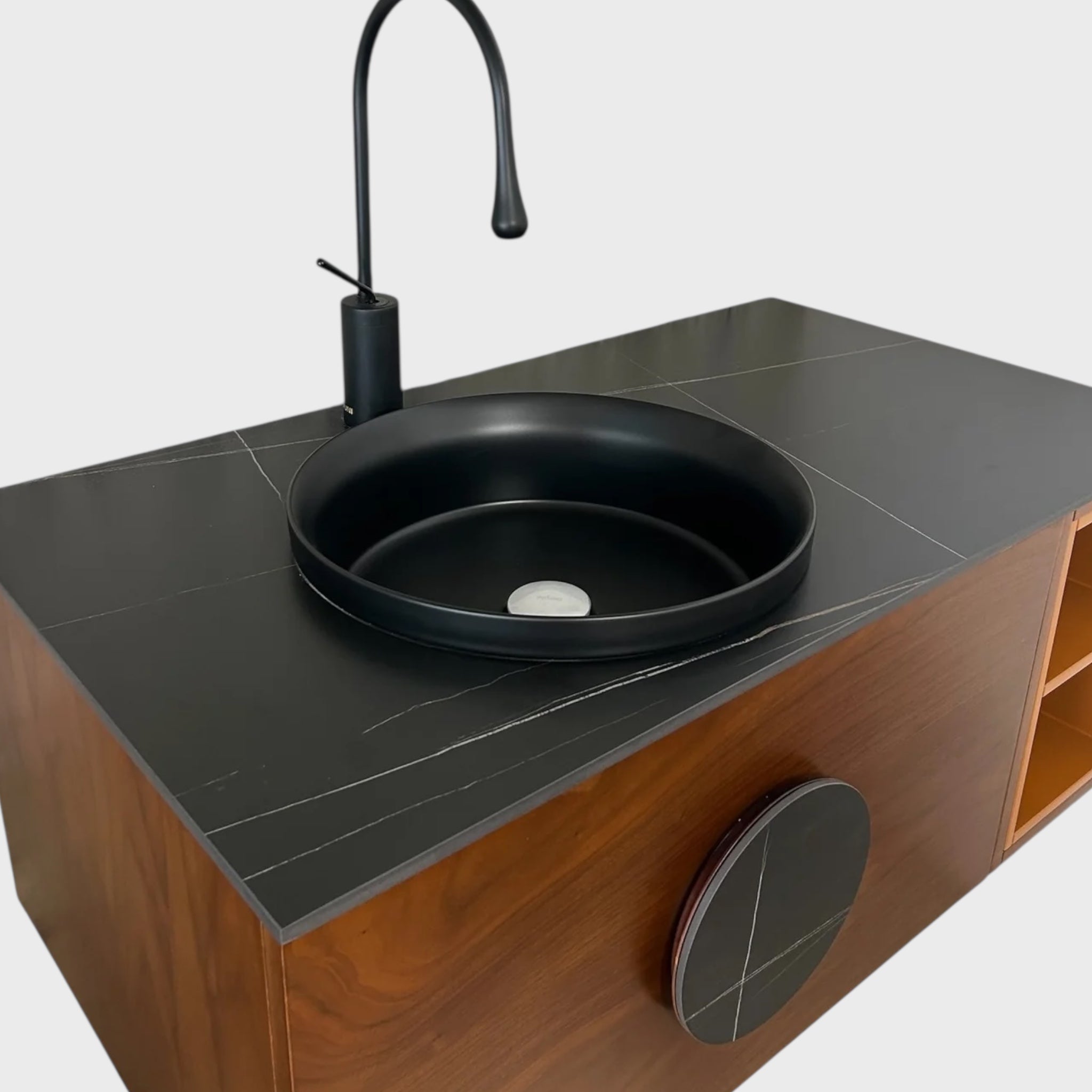 მოდელი აერთიანებს აზიდულ, ჰაეროვან ფორმას და კონტრასტულ მასალებს — თბილი ხის ფაქტურა შერწყმულია შავი კერამოგრანიტის ზედაპირთან, რაც აბაზანას ავსებს თანამედროვე, დახვეწილი სტილით. შავი ნიჟარა აქცენტად იქცევა და ვიზუალურ სიმტკიცეს მატებს მთელ კონსტრუქციას.
