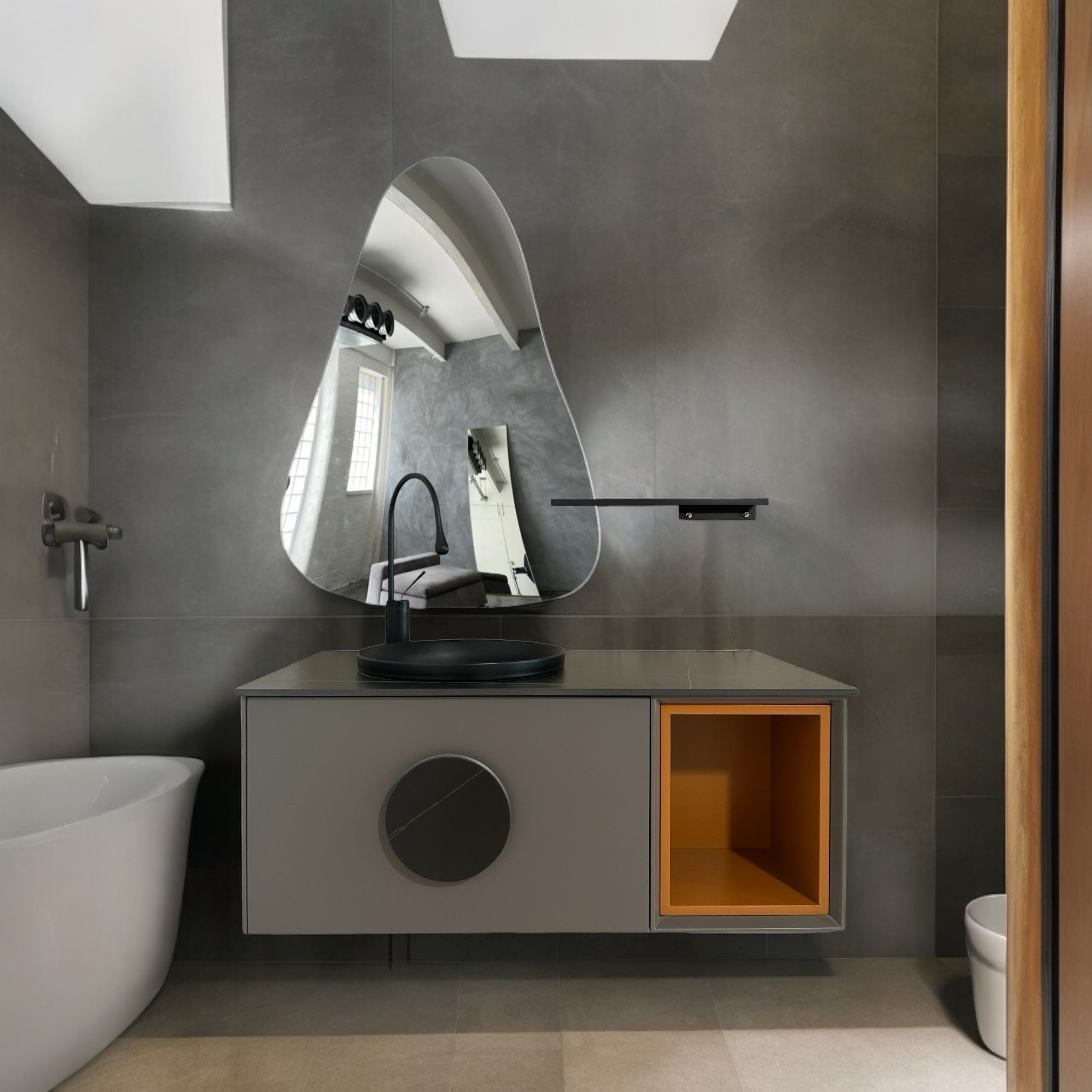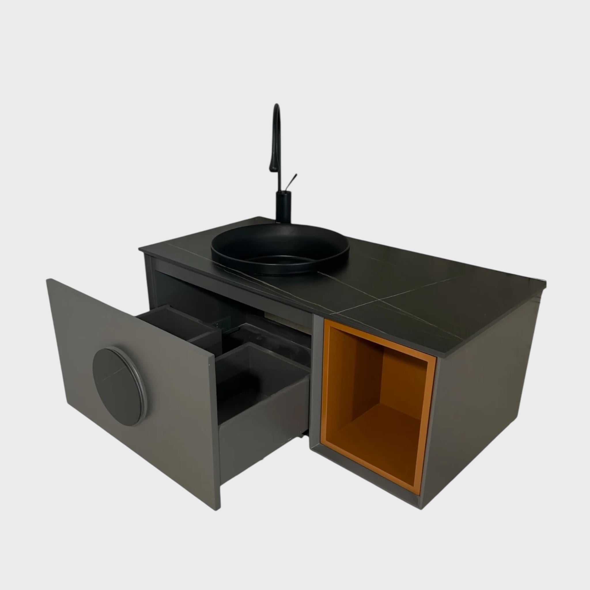 ძლიერი მექანიზმით გაწყობილი უჯრები მარტივად იღება და უზრუნველყოფს ნივთების მოწესრიგებულ შენახვას. გვერდითა ღია თარო კი ყოველდღიური ნივთებისთვის ხელმისაწვდომი და პრაქტიკული ზონაა. შავი ონკანი აბაზანას დამატებით თანამედროვე ხაზს აძლევს.