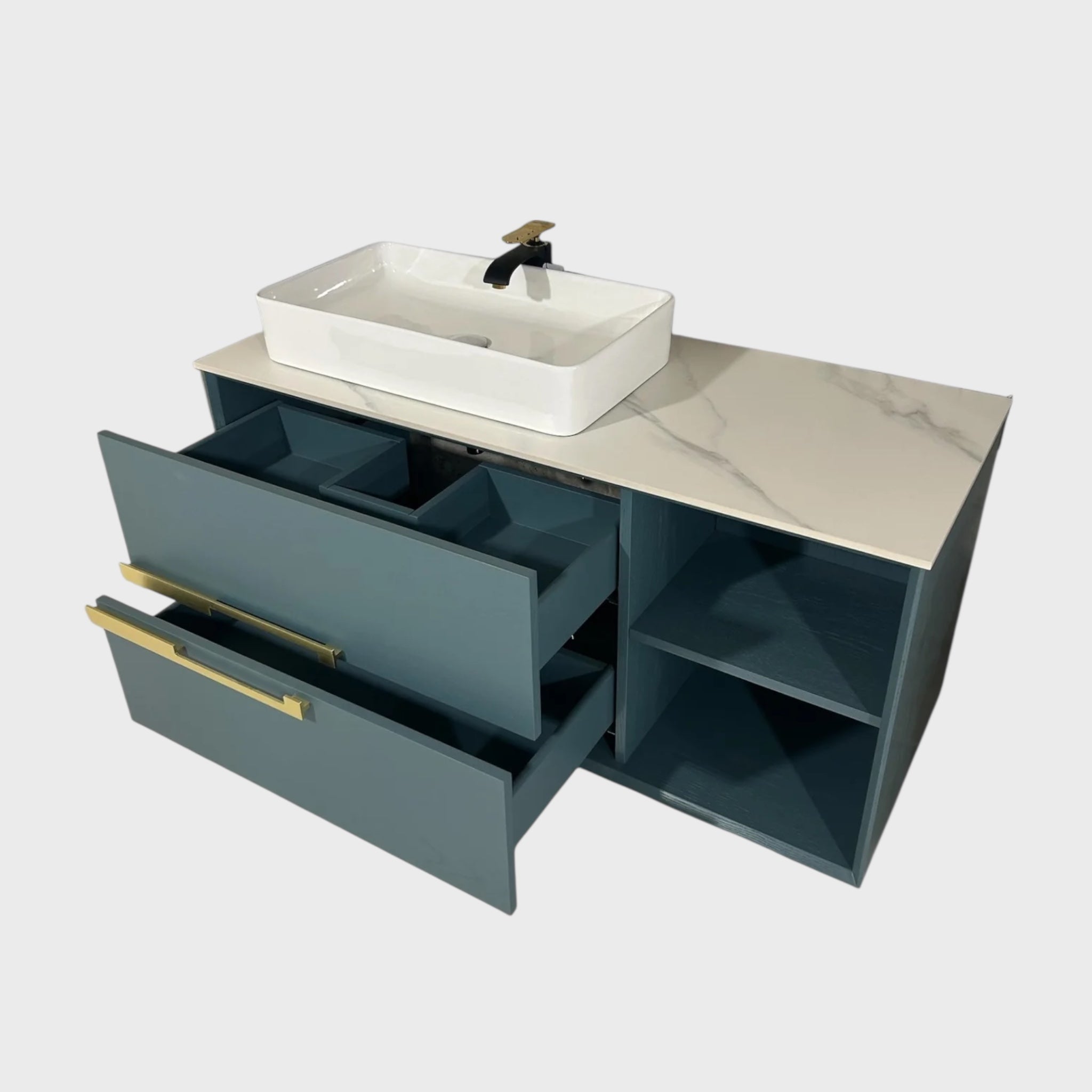 ფუნქციური განლაგება — ფართო ქვედა უჯრები და გახსნილი თაროები — ყოველდღიურ ნივთებს მარტივად ხელმისაწვდომს ხდის.