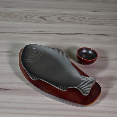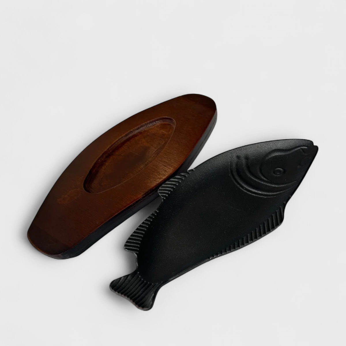 თევზის ფორმის სერვირების თეფში ვიზუალურად გამორჩეულია და შესანიშნავად ჯდება როგორც თანამედროვე, ისე ტრადიციულ სუფრაზე. ხის ბაზა და თუჯის შავი ელემენტი ერთად ქმნის ბუნებრივად ბალანსირებულ ესთეტიკას.