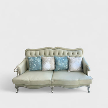 დახვეწილი მოხაზულობა და რბილი ტყავის ტექსტურა ამ ავეჯის ნაკრებს განსაკუთრებულ ელეგანტურობას ანიჭებს. ღრმა ღილებიანი ზურგი და დეტალურად დამუშავებული სახელურები ხაზს უსვამს მის დროისაგან დამოუკიდებელ ხასიათს.