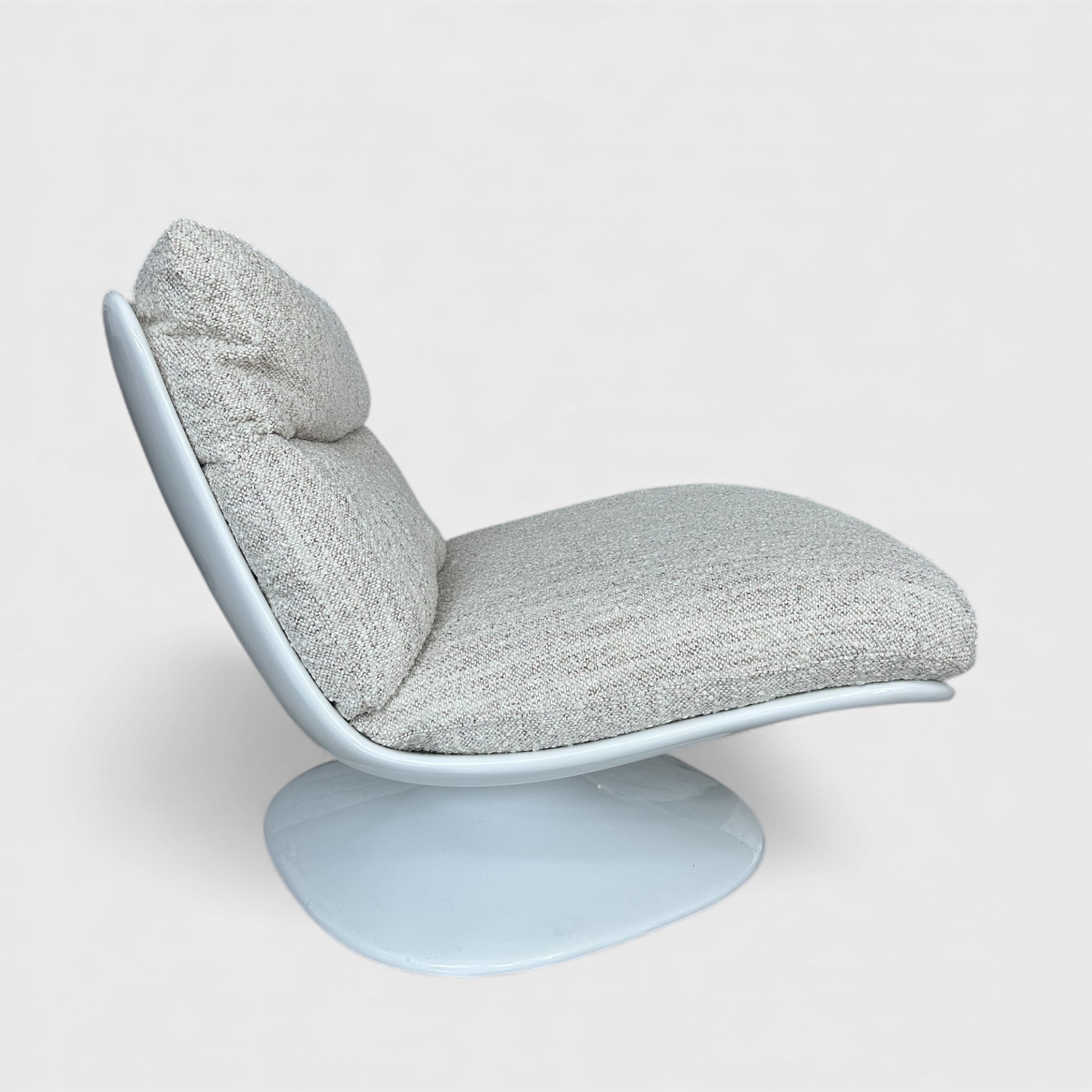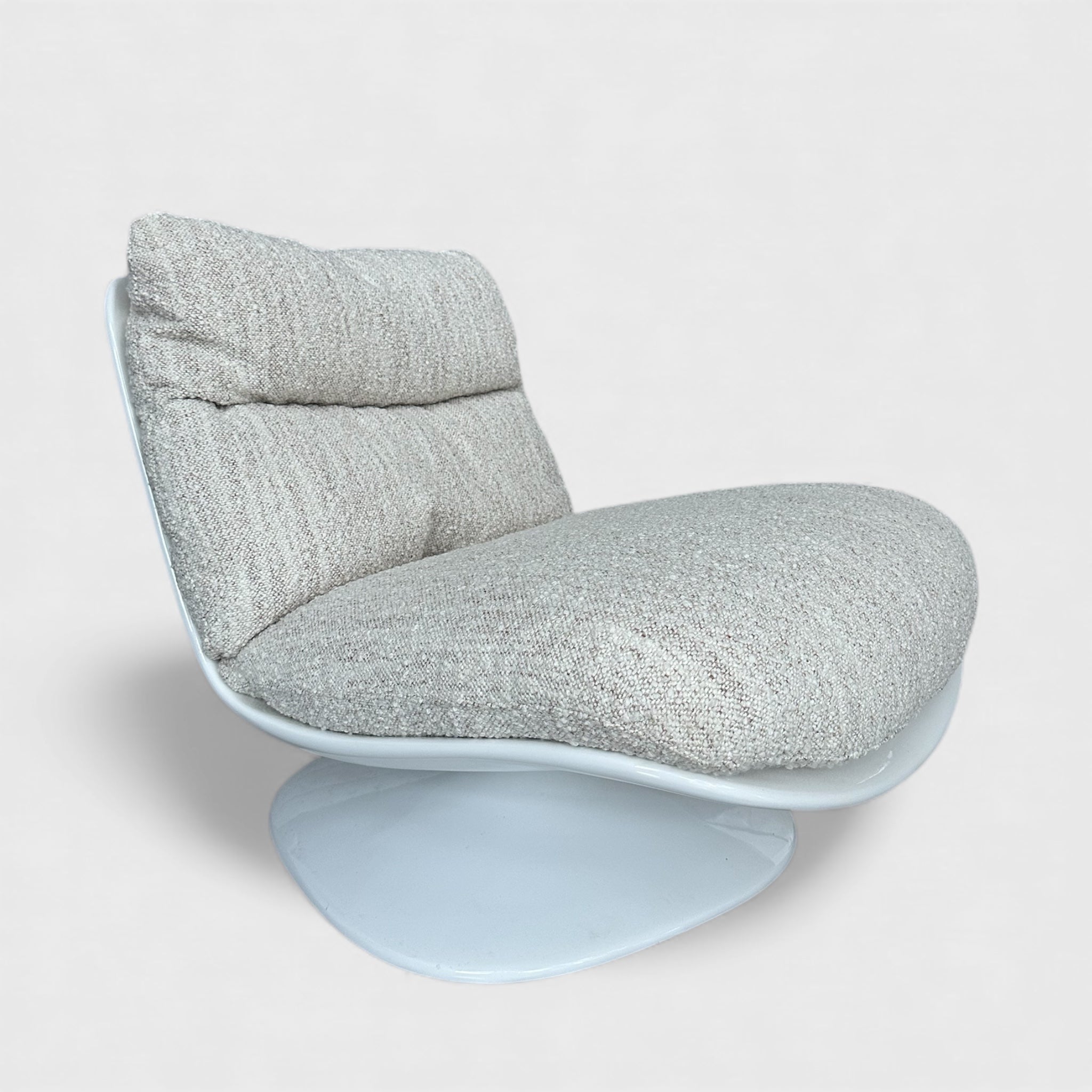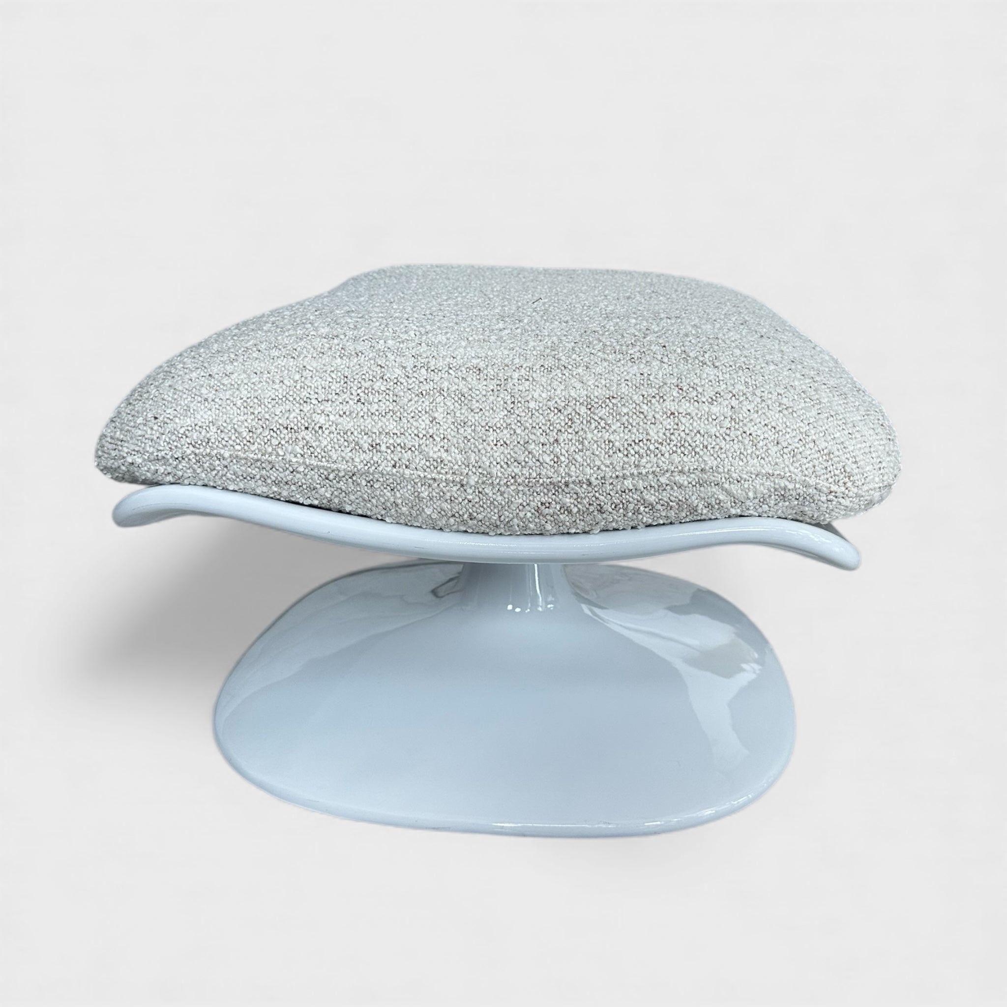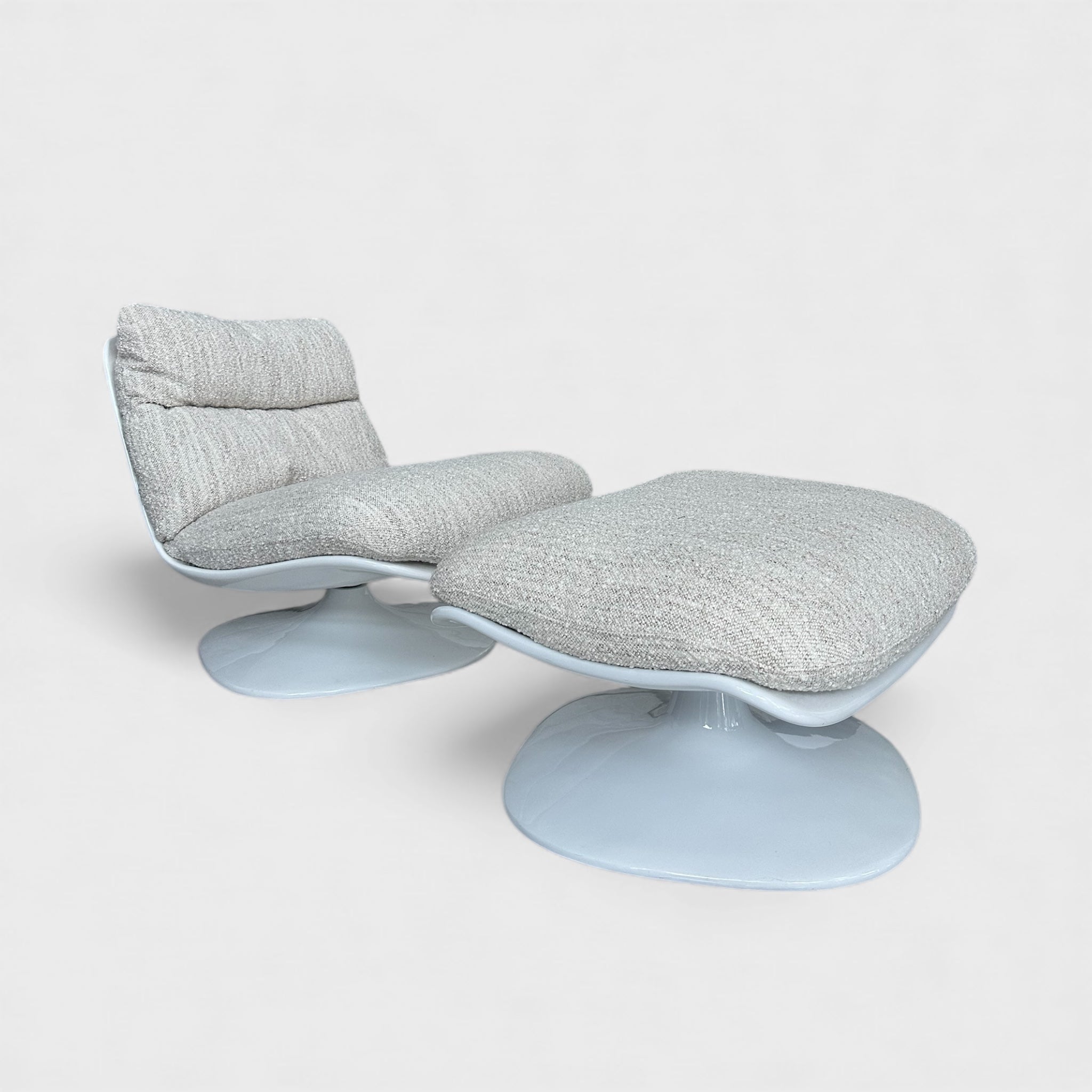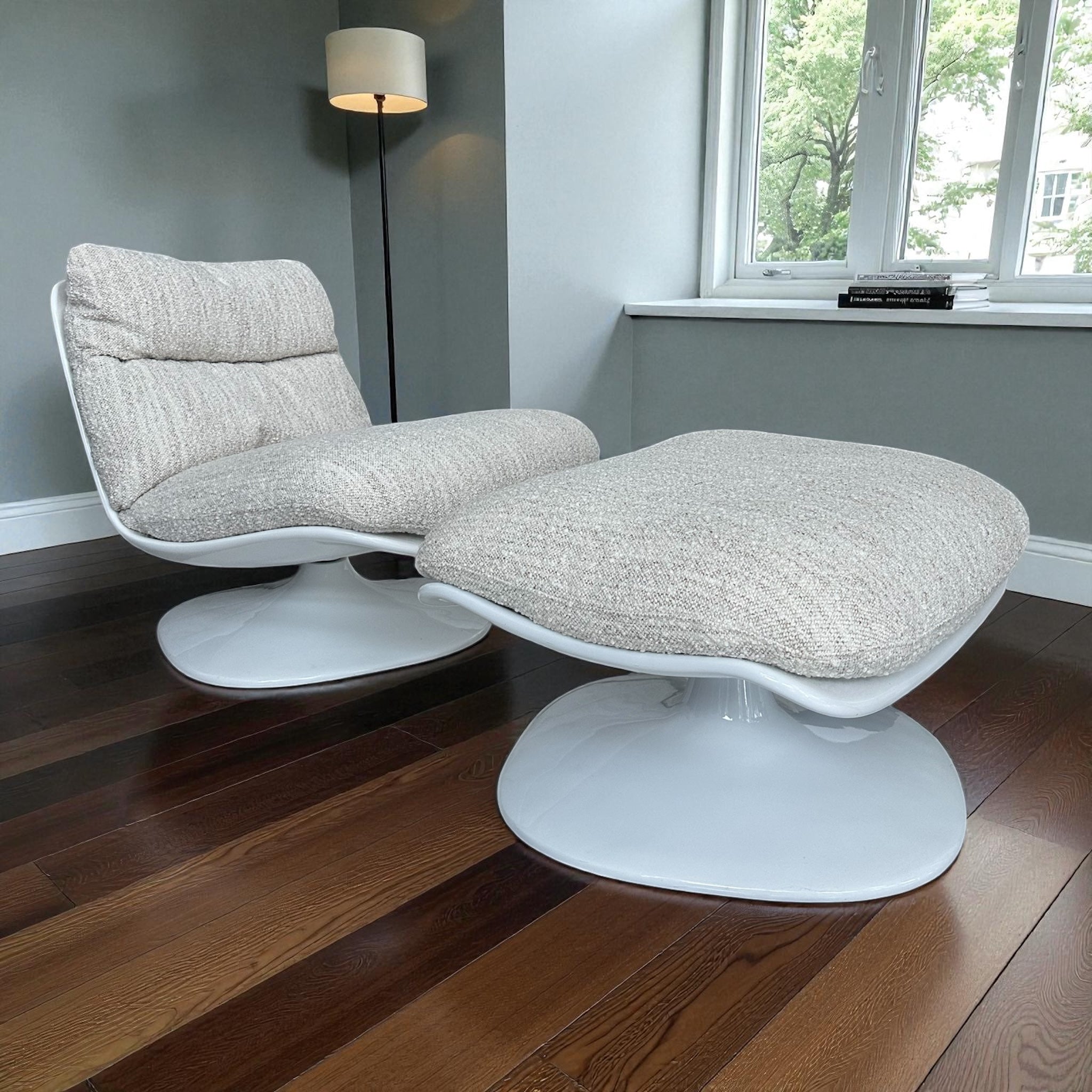 მოსასვენებელი кресლო და პუფი ერთ კომპოზიციაში ქმნის რბილ, თბილ და ვიზუალურად ჰარმონიულ ატმოსფეროს. მრგვალი ხაზები და დაბალი სილუეტი ინტერიერს ანიჭებს მოდერნულ სიმშვიდეს.