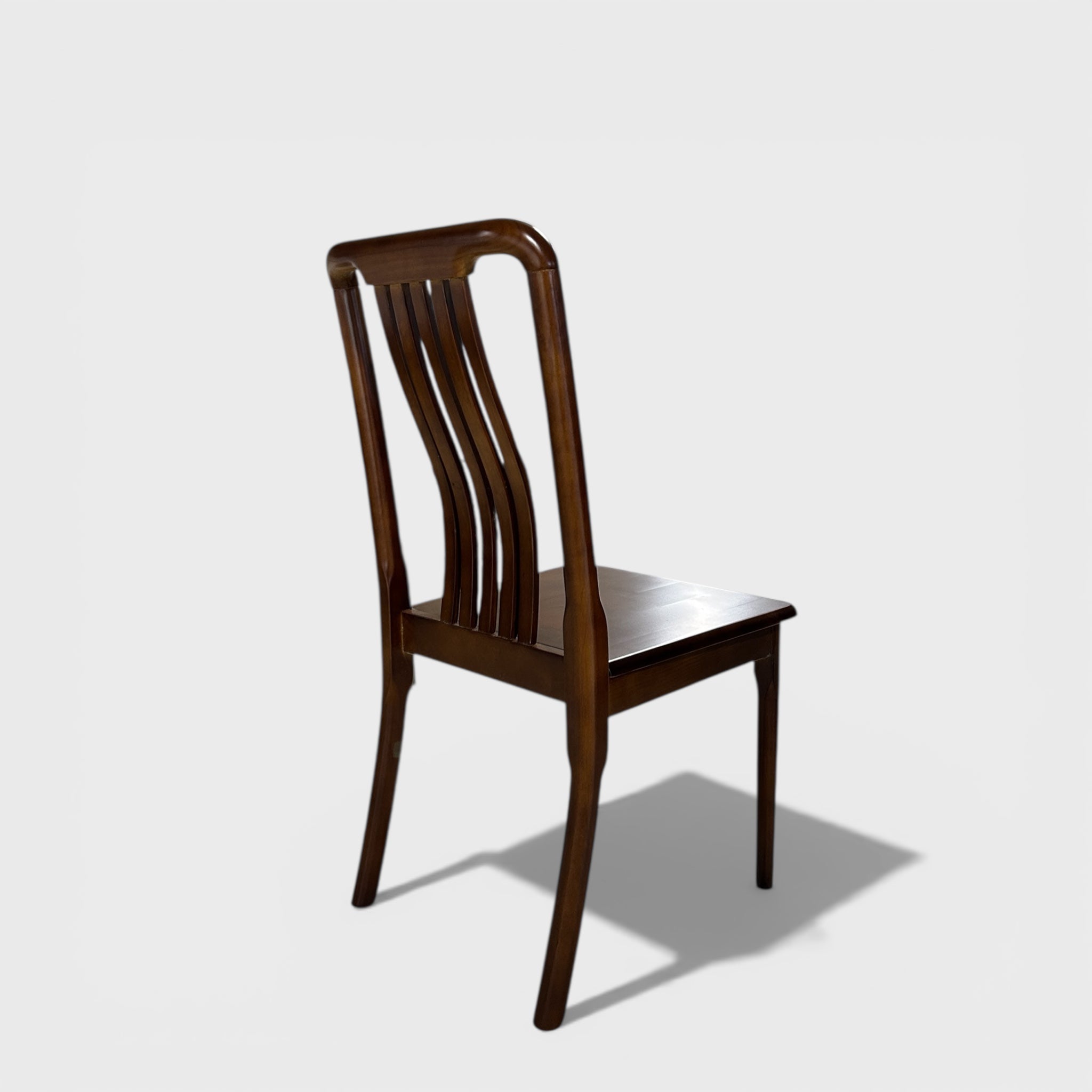 ხის სკამი კლასიკური ხაზებით და დახვეწილი პროპორციებით ქმნის თბილ, დროისგან დამოუკიდებელ ვიზუალს. მოხრილი ზურგის ვერტიკალური ელემენტები დიზაინს ანიჭებს ელეგანტურობას და ხაზს უსვამს ტრადიციულ ხასიათს.