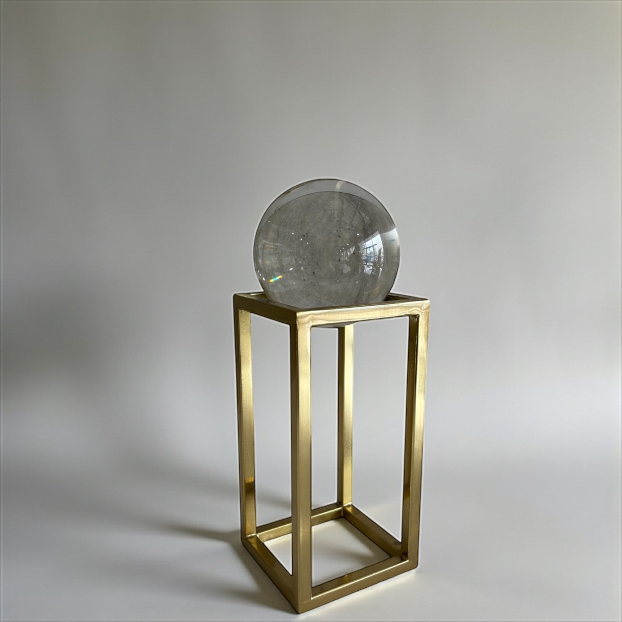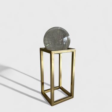 მინიმალისტური, თუმცა მდიდრული კომპოზიცია — გამჭვირვალე მინის ბურთი ბზინვარე ოქროსფერი მეტალის სტენდზე, რომელიც სივრცეს სძენს ელეგანტურ და არტისტულ იერს.