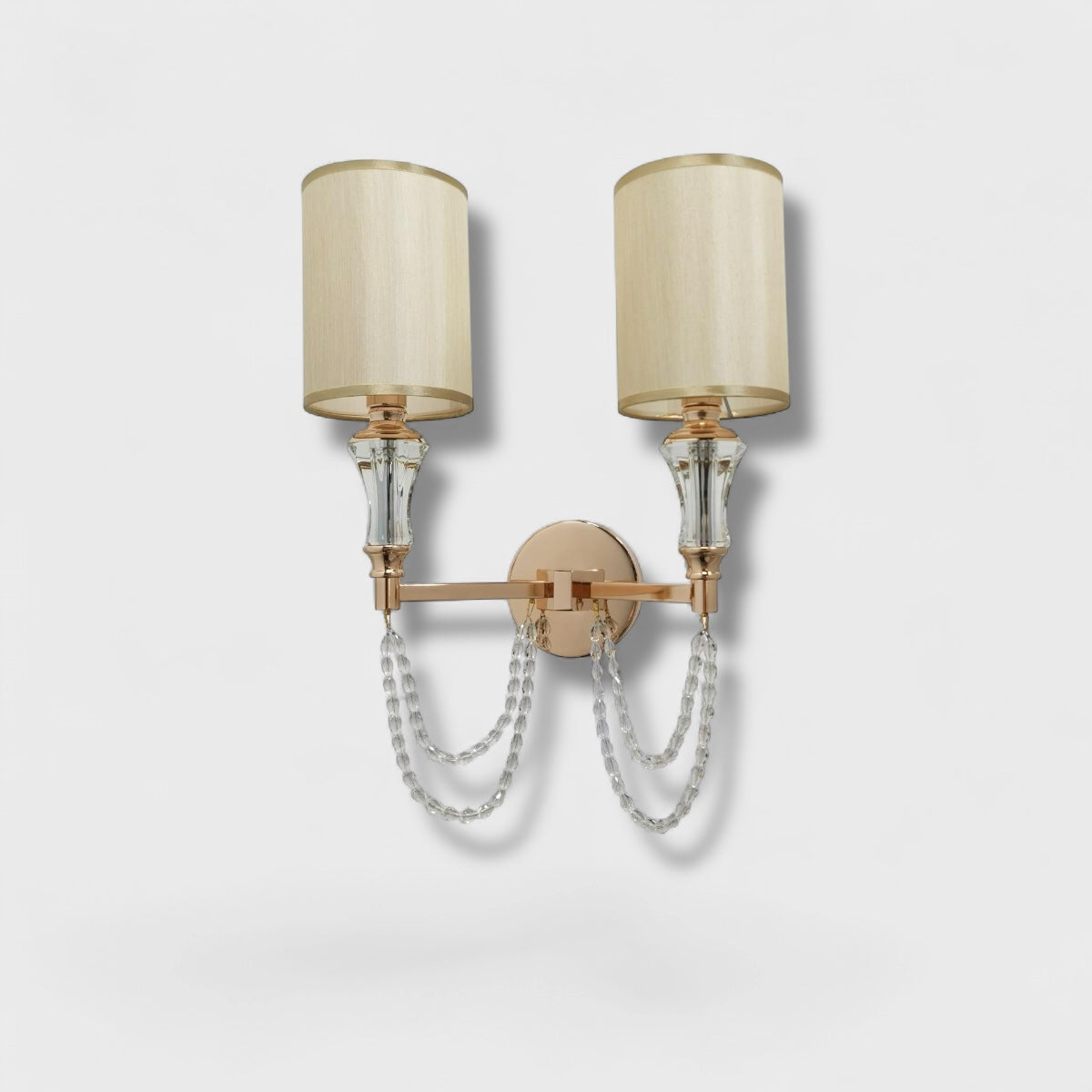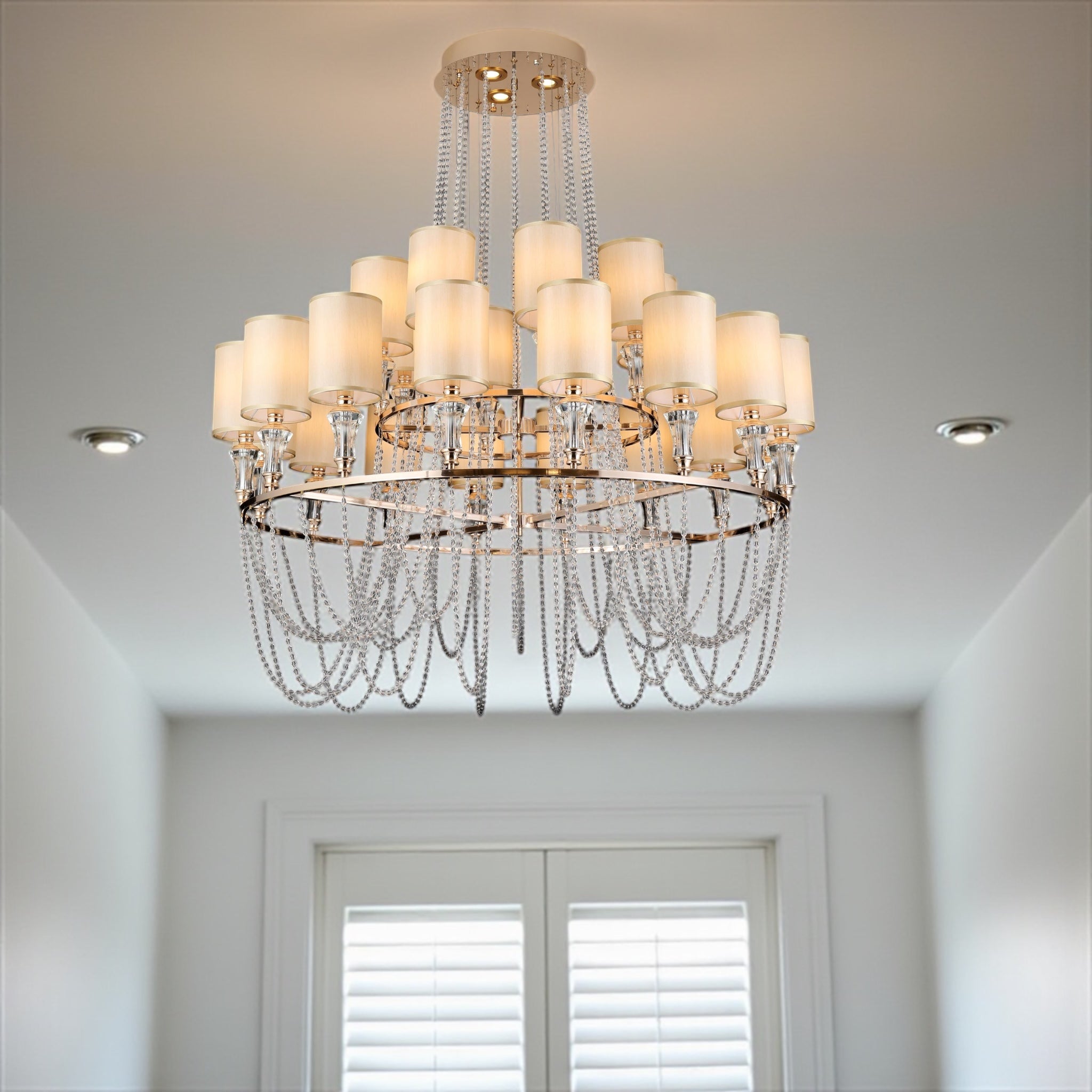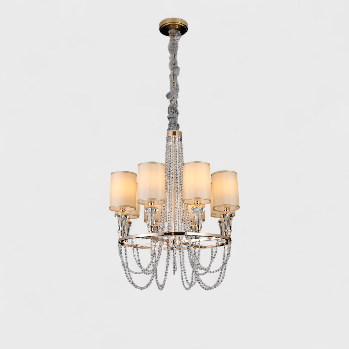 მტკიცე ლითონის ჩარჩო, ქსოვილის აბაჟურები და დახვეწილი კრისტალური დეტალები ქმნის გამძლე და ესთეტიკურად სრულყოფილ დიზაინს.