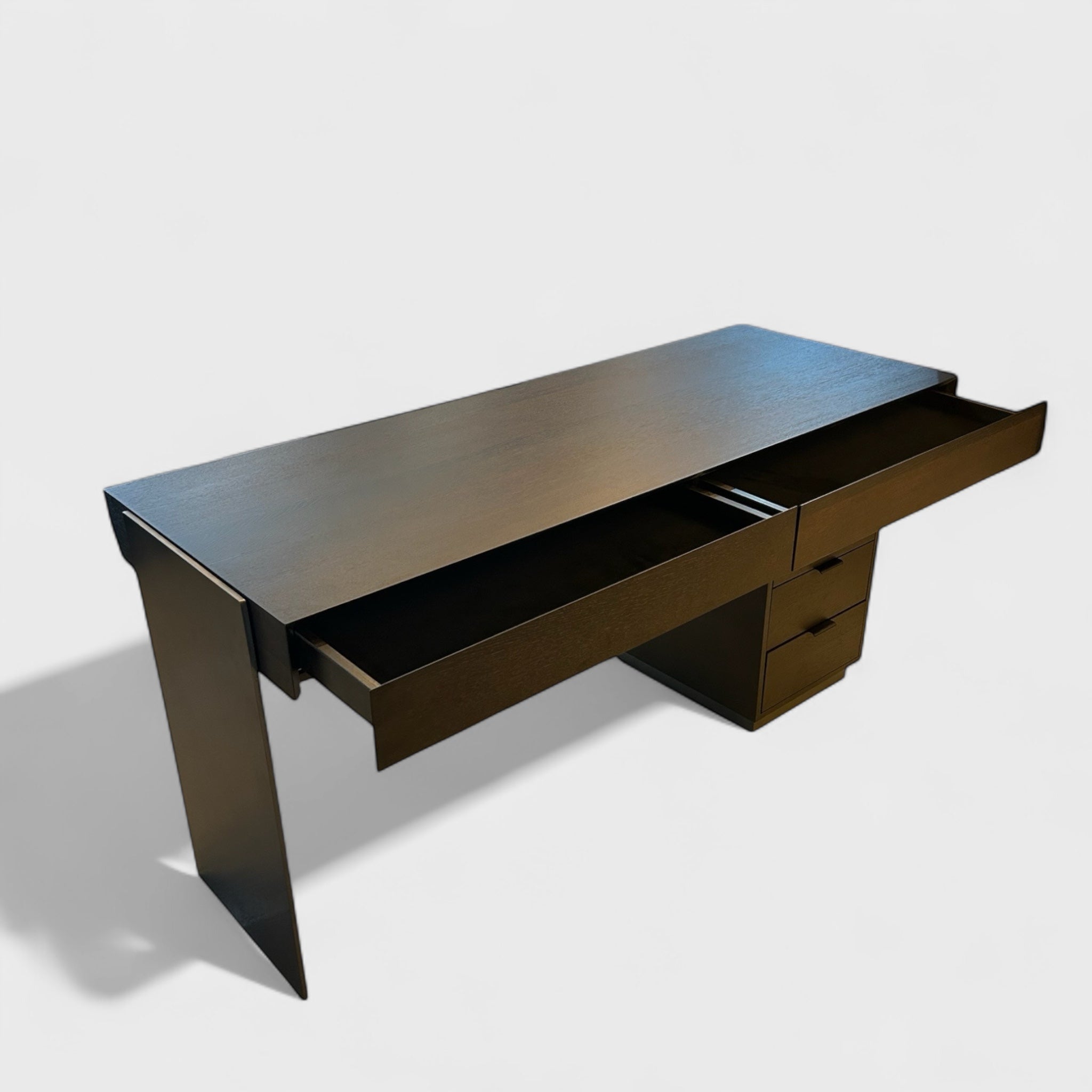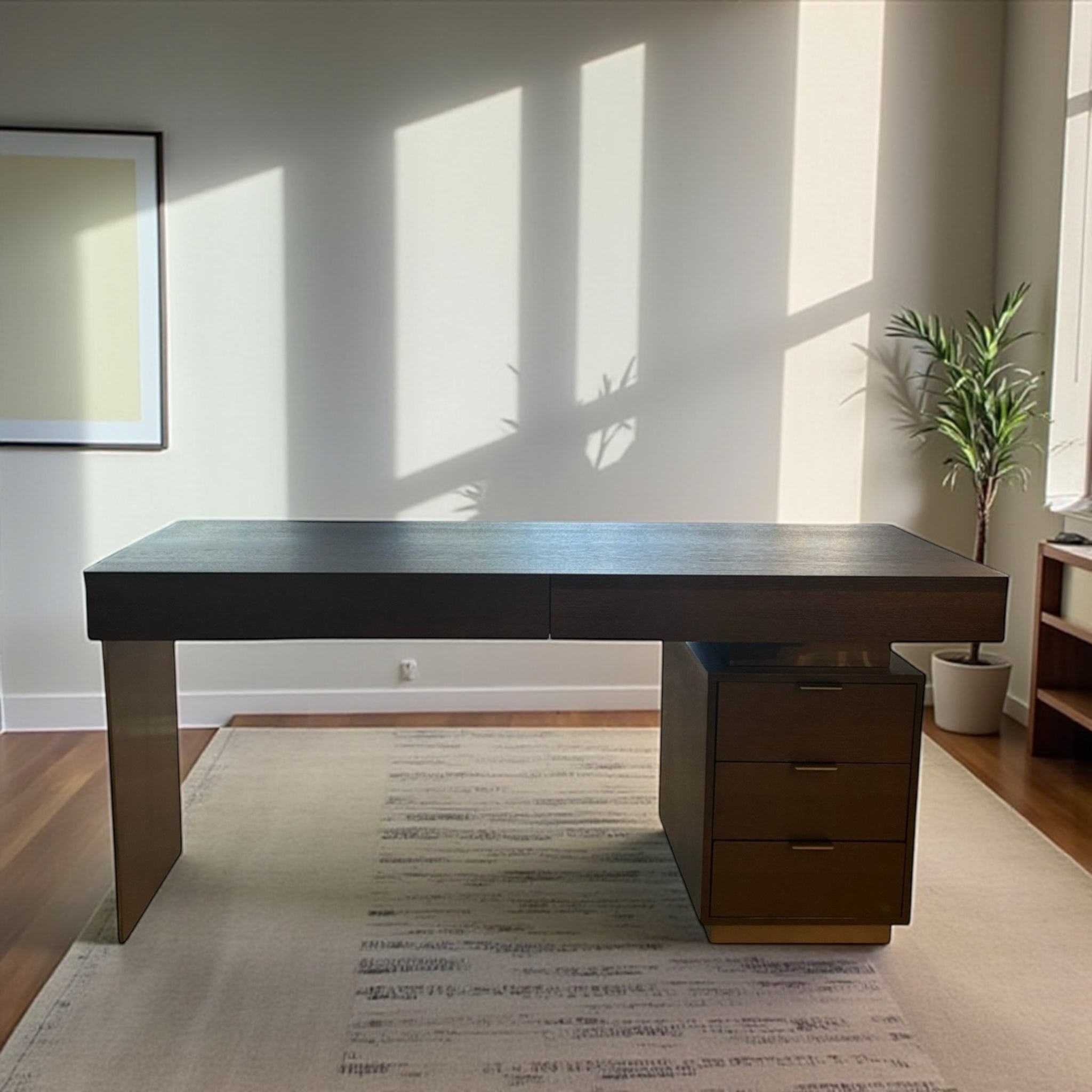 მუქი ხის ზედაპირითა და მკაფიო ფორმებით ეს მაგიდა ინტერიერში ავლენს სოლიდურ და თანამედროვე ხასიათს. სწორი ხაზები და მარტივი კონსტრუქცია მას ანიჭებს დახვეწილ იერს.